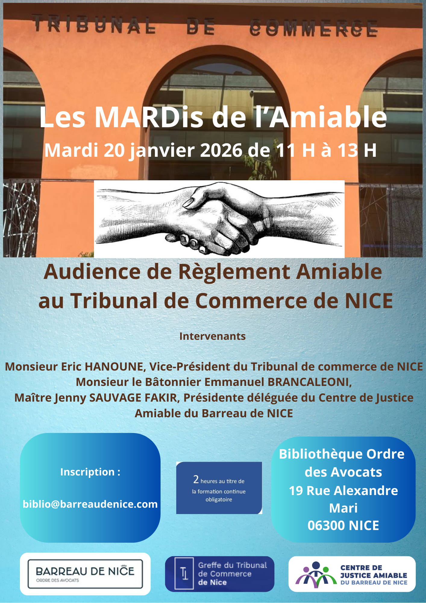 Le Barreau de Nice et le Centre de Justice Amiable vous propose de vous retrouver le mardi 20 janvier 2026 de 11h00 à 13h00 à la bibliothèque de l'Ordre des avocats, au Tribunal de Commerce de Nice en présence de Monsieur Eric HANOUNE, Vice-Président du Tribunal de commerce de Nice, Monsieur le Bâtonnier Emmanuel BRANCALEONI, Maître Jenny SAUVAGE FAKIR, Avocat et Médiateur au Barreau de Nice et Présidente déléguée du Centre de Justice Amiable.